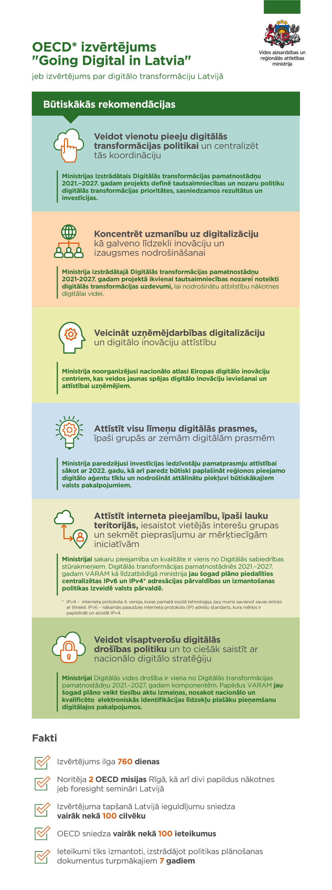 At the initiative of the Latvian Government, the OECD has carried out an assessment with a view to analysing and making recommendations to policy makers in different sectors in order to respond to the challenges and opportunities arising from digital transformation by developing and introducing policy frameworks that promote a sustainable and inclusive digital economy and society.