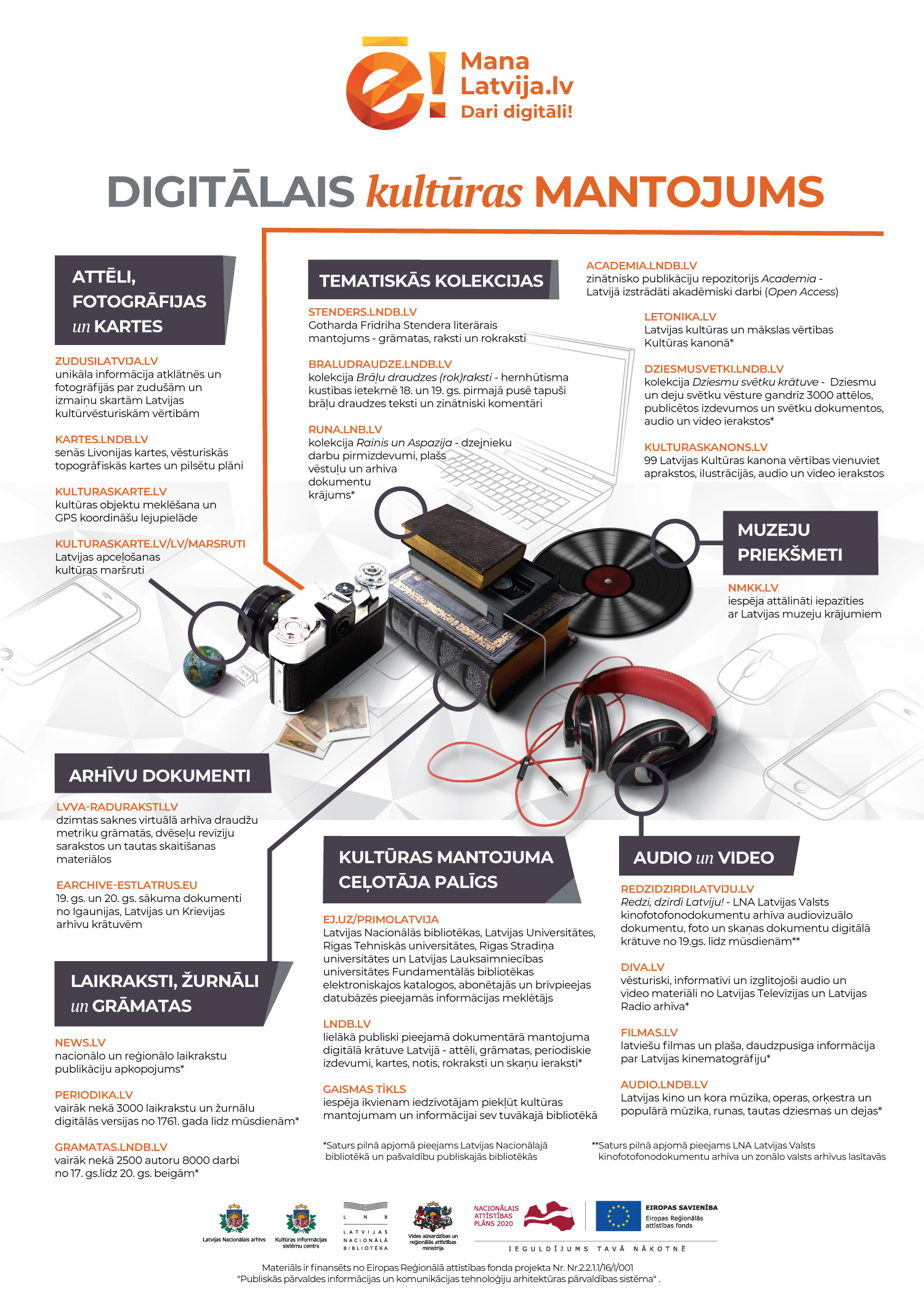 Integrētās mācību un komunikācijas aktivitāšu programmas “Mana Latvija.lv. Dari digitāli!” ietvaros vietnē https://mana.latvija.lv/ izstrādāta dzīves situācija “Studijas un mūžizglītība”, kur ikvienam pieejams digitālais ceļvedis “Bibliotēku resursi”, kas palīdzēs orientēties Latvijas digitālajā kultūras mantojumā. Savukārt izveidotā infografika “Digitālais kultūras mantojums” ļaus vienuviet uzzināt par visiem pieejamiem resursiem.