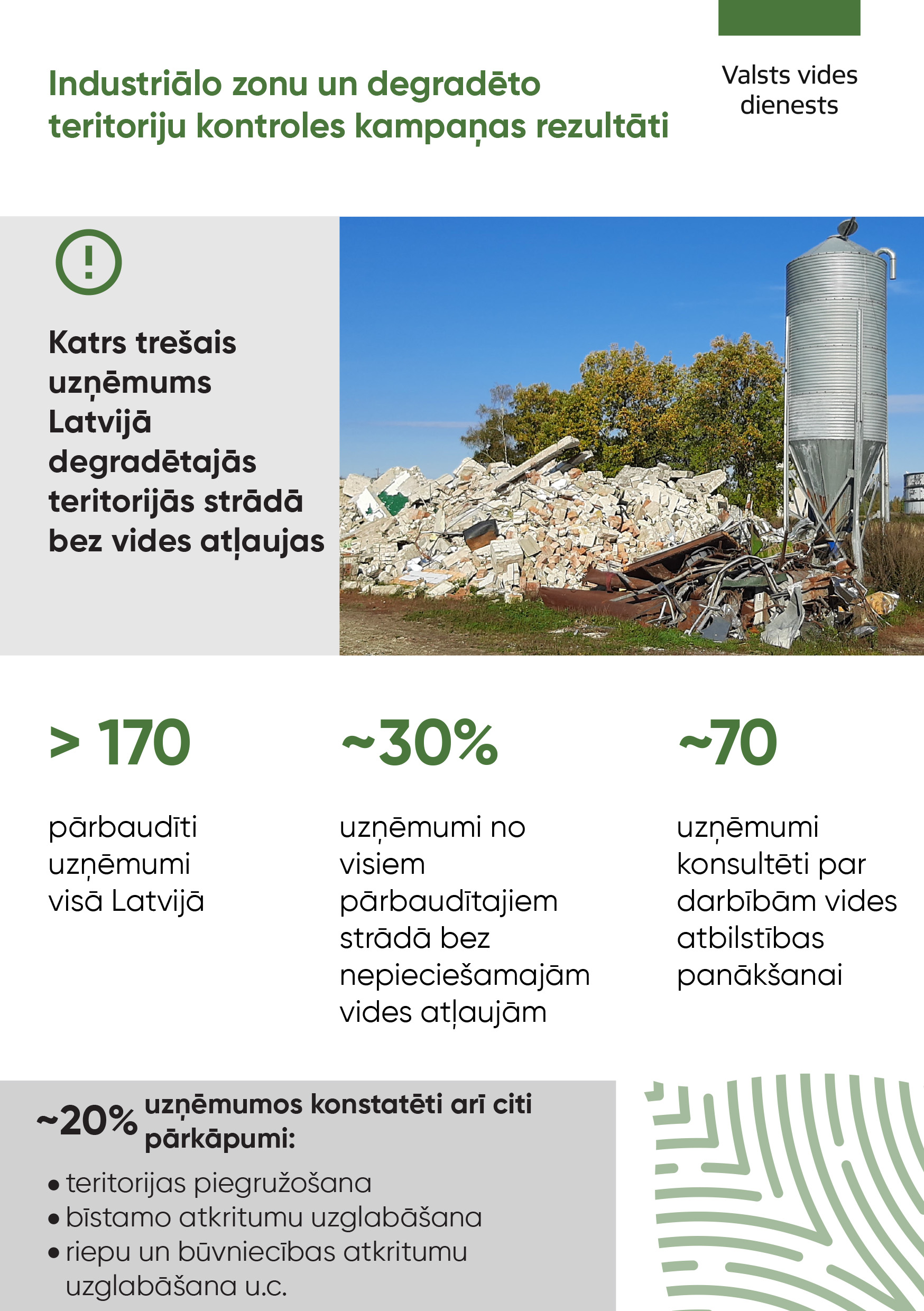 Šonedēļ Valsts vides dienesta (VVD) inspektori veic pārbaudes iepriekš identificētās paaugstināta riska industriālajās zonās un degradētajās teritorijās visā Latvijā, pārbaudot kopumā vairāk nekā 20 dažādas teritorijas un kopumā vairāk nekā 170 uzņēmums. Pārbaužu laikā konstatēts, ka katrs trešais uzņēmums, t.i., ~30% no visiem pārbaudītajiem, strādā bez nepieciešamās atļaujas piesārņojošai darbībai. Lielākoties tie ir uzņēmumi, kas nodarbojas ar nolietoto transporta līdzekļu apsaimniekošanu, autoservisi, kā arī metālapstrādes darbnīcas.