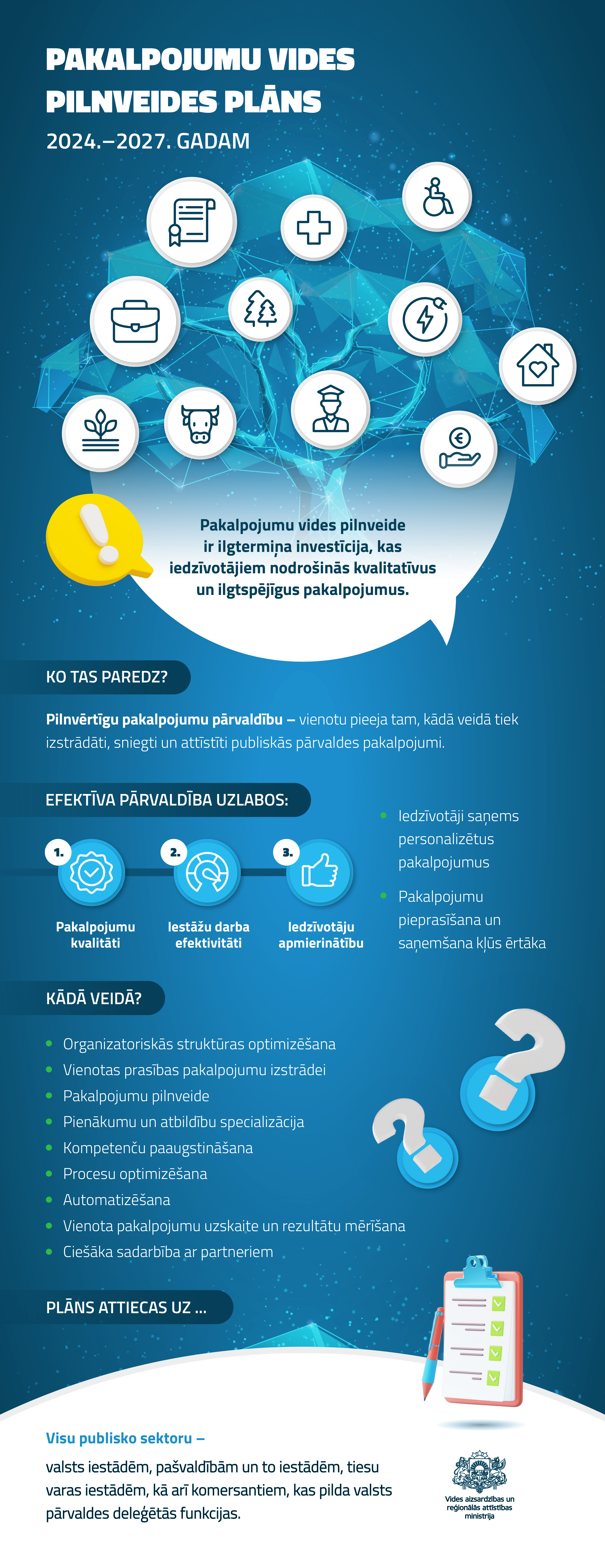 Pilnvērtīga pakalpojumu pārvaldība nozīmē to, ka ir vienota pieeja tam, kādā veidā tiek organizēta pakalpojumu nodrošināšana - izstrādāti, sniegti un attīstīti pakalpojumi. Izstrādātais plāns attiecas uz visu publisko sektoru – valsts iestādēm, pašvaldībām un to iestādēm, tiesu varas iestādēm, kā arī komersantiem, kas pilda valsts pārvaldes deleģētās funkcijas.